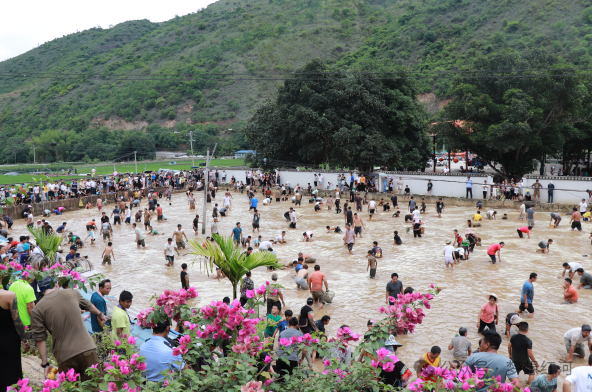 在河水摸鱼环节,游客们卷起裤腿,撸起袖子,在田里来回跑动捕捉鱼儿。虽水花飞溅、满身污泥,大家却乐在其中,欢声笑语回荡在山水田野间。