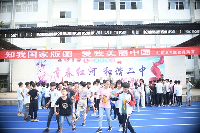 县自然资源局工作人员到西山社区、跑马路社区、凹腰山社区以张贴海报、派发宣传纸杯、环保袋、宣传册等宣传材料的形式开展了宣传活动,并为前来咨询的居民耐心解答了地理信息及测绘相关的法律法规方面的问题;在县第二中学设宣传台,以悬挂横幅、张贴海报、派发笔袋、宣传册等方式,将测绘法及国家版图意识宣传教育带进了校园,呼吁大家一起强化国家版图意识,共同守护美丽中国,强化了同学们对国家疆域的认知、认同和自觉维护的意识。活动中,同学们还纷纷在横幅上写下了对祖国的美好祝愿,以此表示这些朝气蓬勃的少年对迎接新中国成立70周年的一份心意。