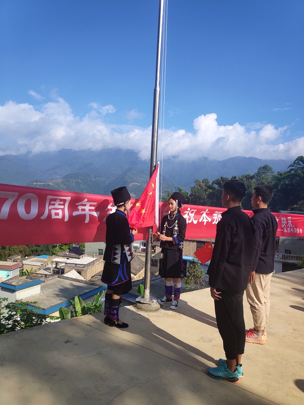 “今年很巧,是祖国母亲70周年生日,也是台安村十月年(哈尼话:扎勒特),从建村一百余年,我们村第一次在村干部和年轻人的倡议下,组织全体村民穿上节日的盛装进行升国旗、唱国歌活动。200多村民齐声高唱国歌。“起来!不愿做奴隶的人们!”每一个参与升国旗的村民的心都和建立共和国的仁人志士一起激荡,那一刻我非常激动,我相信当时在场的很多人和我一样都留下了幸福的热泪!我们村的大学生李旭东同学策划了台安村第一次升旗仪式,而且好多节庆都是他在幕后策划的,以他为代表的大学生是我们台安全体村民的骄傲!” 三妹无比激动地说道。