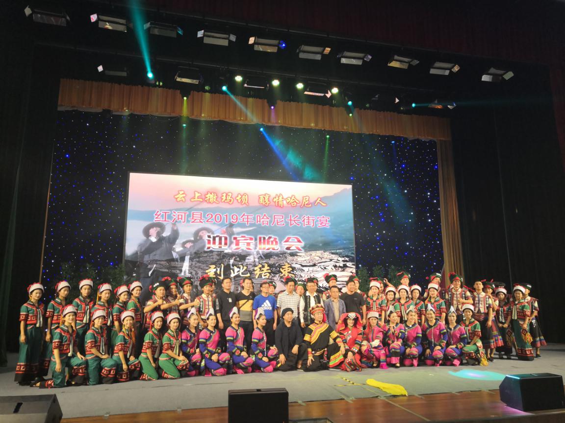 2019年红河县长街宴迎宾晚会11月15日晚在红河县人大会堂圆满完成,晚会以《哈尼四季生产劳作》为主题,由《家园的花》、《冬田樱花》、《春田水花》、《夏田青花》、《秋田稻花》、《逐梦成花》组成,时长60分钟,