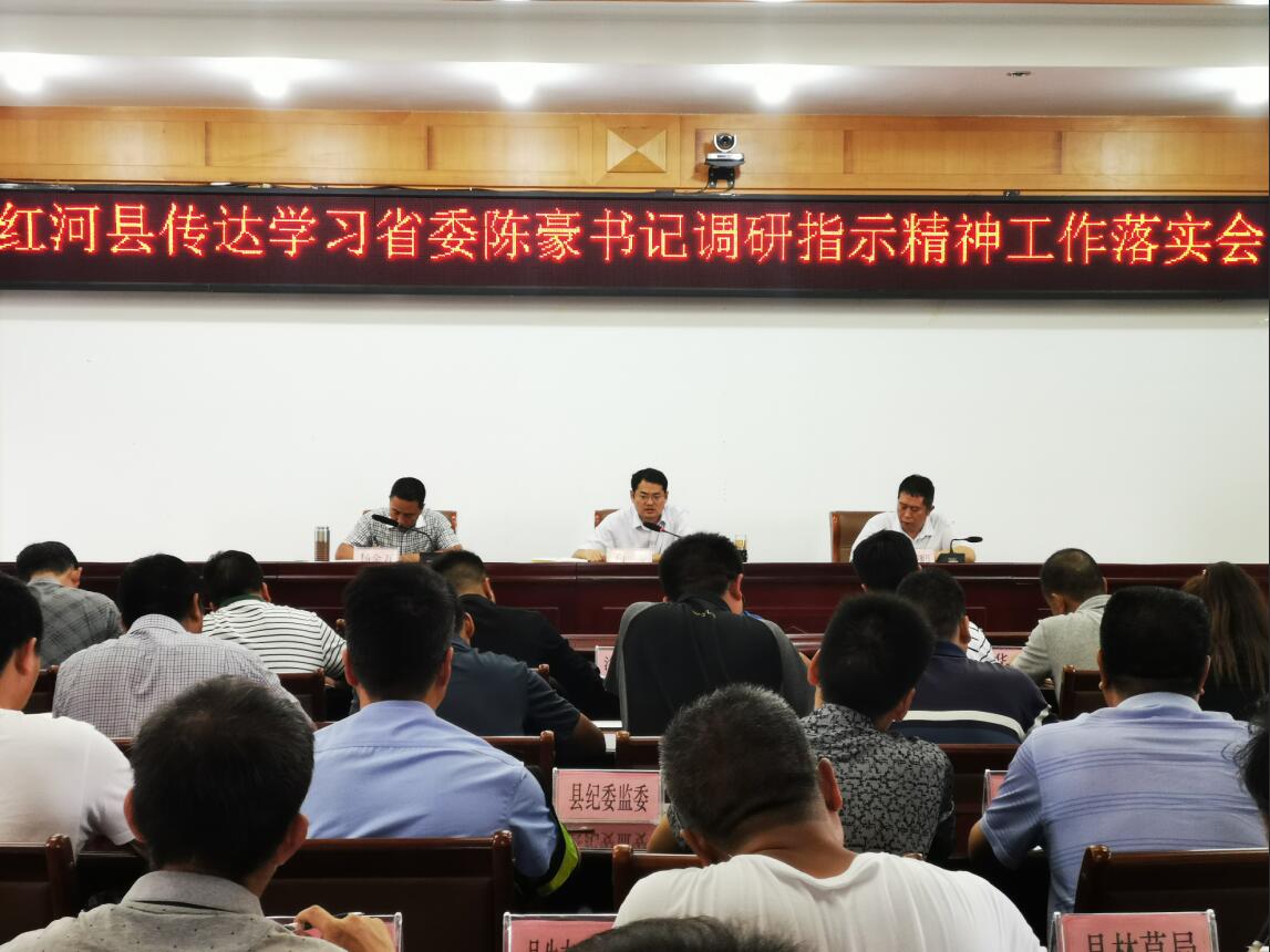 和涛传达省委陈豪书记到红河县调研指示精神。陈豪书记在红河县调研期间,要求红河县确保如期完成脱贫攻坚工作任务,加强扶贫财政资金管理使用,做好人居环境提升工作。在红河州调研工作座谈会上,陈豪书记要求在加强学习、提高能力上下硬功夫,在问题导向、整改落实上下硬功夫,在解决“两不愁三保障”突出问题、提高脱贫质量上下硬功夫,在层层压实责任、切实改进作风上下硬功夫,坚决如期高质量打赢脱贫攻坚战。