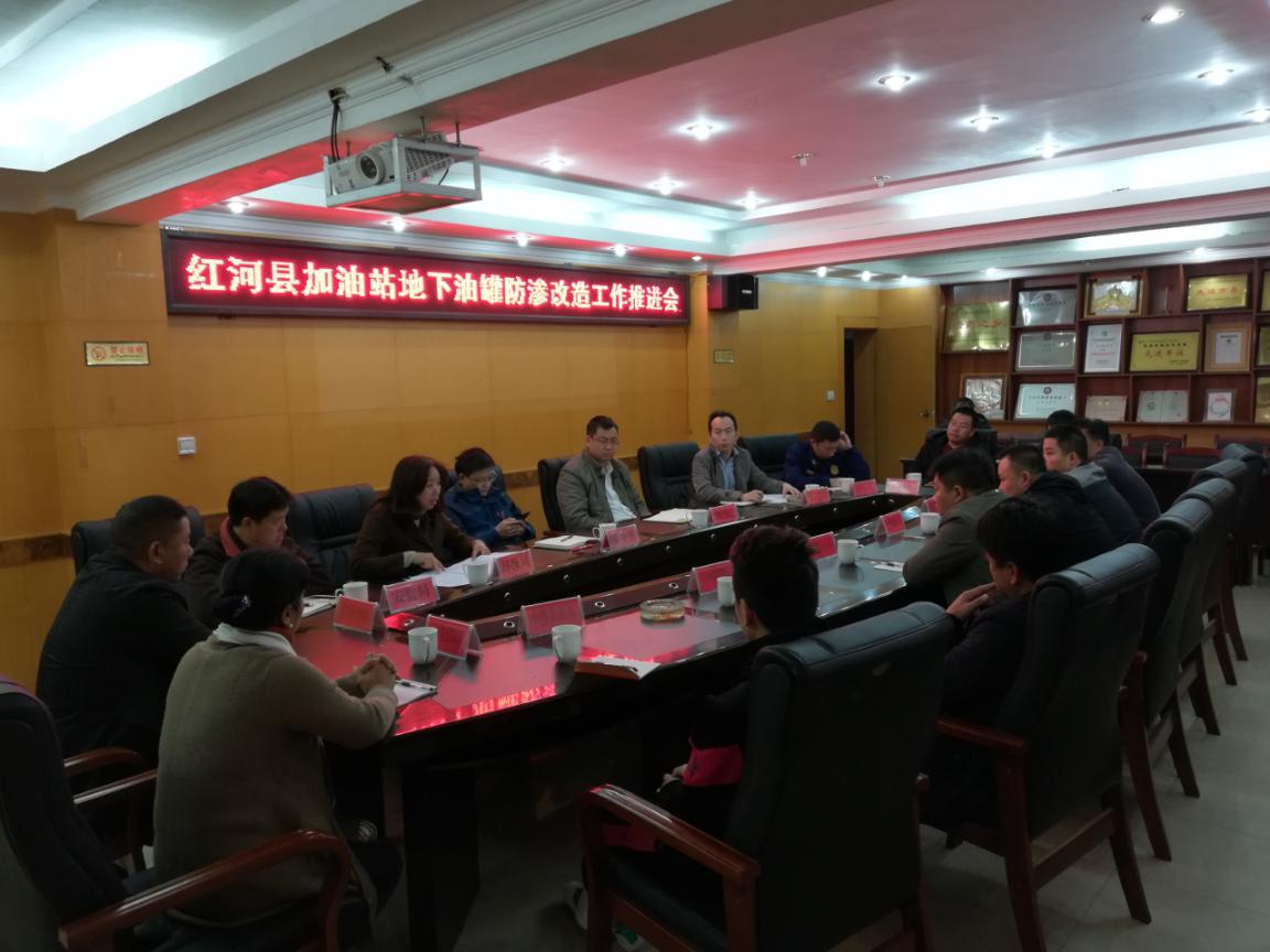 1月19日上午,红河县召开加油站地下油罐防渗改造工作推进会。县委常委、常务副县长蒋国红,县环保局、工信局等有关部门负责人,18家加油站经营业主参加会议。