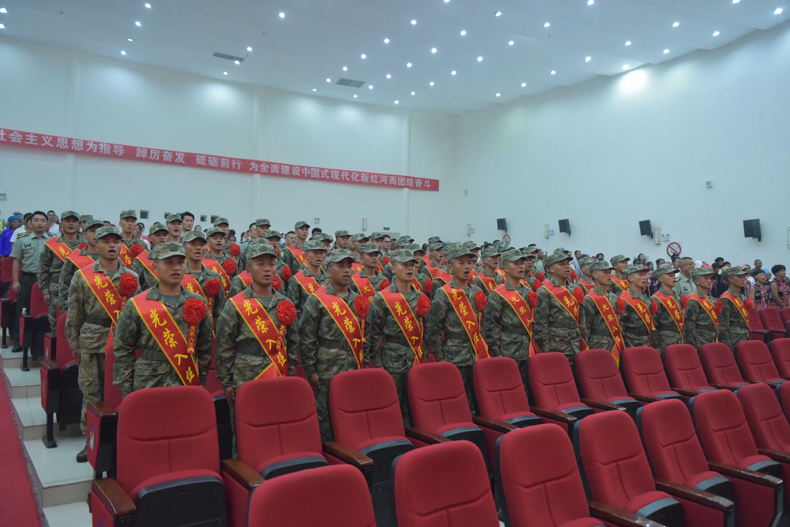欢送大会上,新兵们身着戎装、胸佩红花、肩披绶带,精神抖擞、意气风发,展现出了红河县青年“报党报国报家乡”的高昂士气。