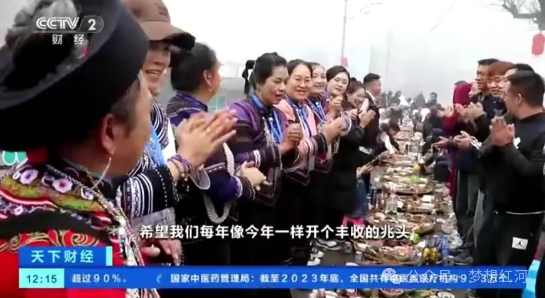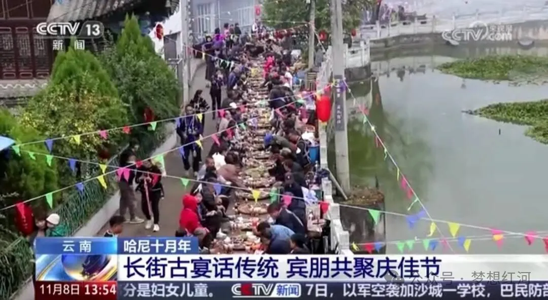 在红河县甲寅镇咪田村,身着节日盛装的哈尼姑娘小伙载歌载舞,唱起祝酒歌,他们与宾客相互碰杯、敬酒,共同预祝今年风调雨顺、五谷丰登。长街宴上,摆满了哈尼蘸水鸡、小黄牛干巴、梯田鱼等十多种哈尼风味的佳肴,让宾客们胃口大开。席间,宾客们杯觥交错,一声声“哆撒”此起彼伏,大家相互碰杯,互道祝福,从龙头敬到龙尾,现场充满了喜气热闹气氛。