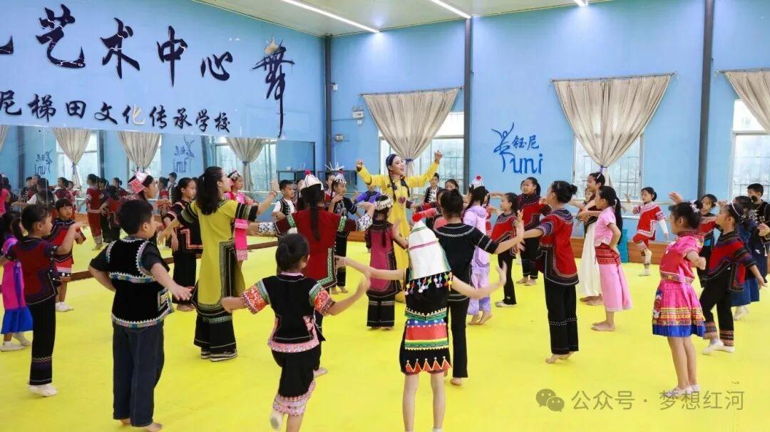 红河县世居汉族、哈尼族、彝族、傣族、瑶族5个民族,少数民族人口占比超过96%,其中哈尼族占全县总人口的80%以上,是全国哈尼族聚居人口最多的县。红河县依托哈尼族多声部民歌、乐作舞等国家级非遗的深厚底蕴,致力于推动各民族文化的保护、传承与创新,并通过培养传承人、推动民族文化进校园等多种方式,守护民族文化的血脉。其中,由杨钰尼创办的钰尼文化艺术传承中心便是杰出代表,迄今已培养3000余名“小小传承人”,为铸牢中华民族共同体意识注入了蓬勃生机。