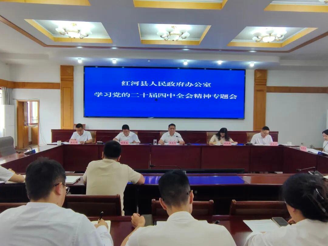 10月31日,红河县人民政府办公室召开学习党的二十届四中全会精神专题会,深入学习党的二十届四中全会精神,安排部署学习贯彻工作。会议要求,全体干部职工要深刻领会全会精神的核心要义,切实把思想和行动统一到党中央决策部署上来。作为政府运转的中枢机构,要以更高标准、更严要求深入学习贯彻全会精神,深学细悟筑牢思想根基;要以更高站位协调服务、更高效能督办落实、更实作风提供保障,为谱写中国式现代化红河篇章贡献政府办公系统力量。