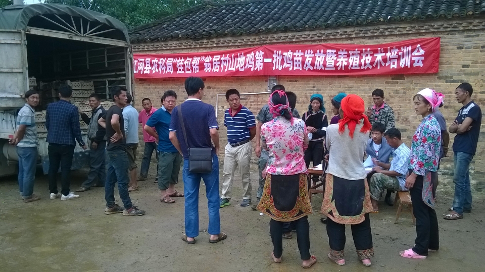 为带动翁居村委会养殖脱贫发展,翁居村驻村工作队走访调查后挑选出20户建档立卡贫困户作为第一批山地鸡养殖带头示范户。由县农科局免费为每户示范户发放免费鸡苗100只,这些鸡苗全部由红河县沣圃园养殖有限责任公司提供,纯土鸡鸡苗,已经过28天的培育和防疫,抗病能力强,易于饲养。