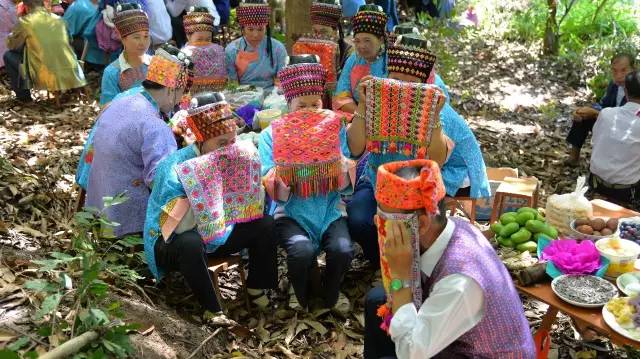 傣拉蒙面情歌传唱现场,来自红河、元江、元阳两地州三县数百名傣家人和游客们相聚在芒果树下,摆上传统的粽子、香蕉、荔枝等美食,大家围着桌子相对簇拥而坐,用亲手编织的七彩手帕,蒙着面相互对唱,相互倾诉衷肠、爱意绵绵。