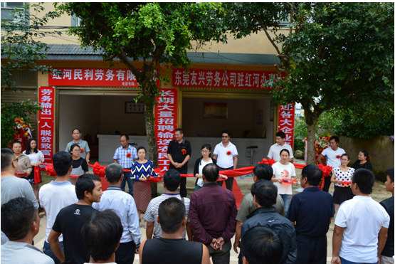 8月8日,红河民利劳务有限公司、东莞友兴劳务公司驻红河办事处在三村乡黑树林广场成立并举行了剪彩仪式。红河县人力资源和社会保障局局长杨泽文、三村乡主要领导、东莞友兴劳务公司总经理李燕科及红河民利劳务有限公司总经理李冲龙参加剪彩仪式。