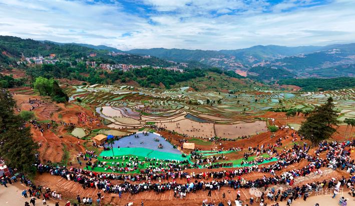 五月的红河县,哈尼梯田如翡翠镶嵌山间,层层叠翠间传来大号与牛角号的和鸣。5月1日至5日,云南民族团结进步大舞台暨红河县开秧门·仰阿娜文化系列活动在此启幕。这场以民族团结为媒,以非遗展演为魂、以田间劳作为脉的文化活动,在万亩梯田之上奏响了千年农耕文明的当代乐章。