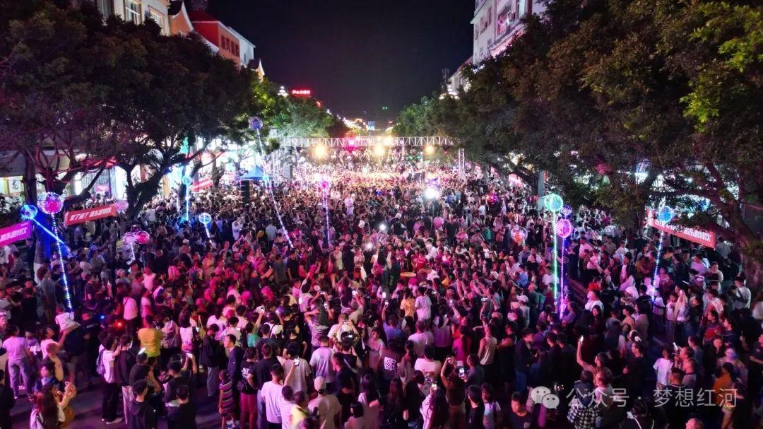 当暮色漫过古城,红河县莲花大道变身“非遗狂欢场”,万人共舞被列入第二批国家级非物质文化遗产名录的乐作舞。13个乡镇的各族群众身着节庆盛装,与游客手拉手围成数百个同心圆,一同跳起这流传千年的舞步,游客们仿佛在乐作的歌、舞、乐中穿越时光、跨越年龄、地域,尽情享受乐作舞带来的快乐,“各民族像石榴籽一样紧紧抱在一起”在乐作舞的韵律中不断具象化。