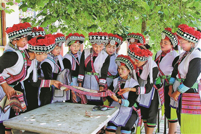 民族手工艺业带动共同致富。依托弥勒市山咔咔物业管理公司,形成“党总支+村级劳务合作组织+脱贫劳动力”就业模式,带动100余名灵活就业人员实现稳定就业,临时用工1500余人次。组织开展草编、竹编、刺绣等旅游产品制作,有效解决农村剩余劳动力就业问题,每年可实现村集体经济收入10万元以上,带动全镇转移就业脱贫劳动力494人,实现村集体经济发展提档加速。同时,该村依托当地土蜂蜜、核桃、阿细刺绣等农特产品,进行综合开发,包装策划一批文创产品和农特产品,致力于打造“阿细”特色品牌。引进10余家中小型商家入驻,带动在外人员回乡开办乡村客栈、农家乐、特色餐馆、手工作坊、旅游特产销售店等61家,户均年增收5万余元,走出了农文旅融合助力乡村振兴的新路子,实现产业发展与群众增收共融共促。