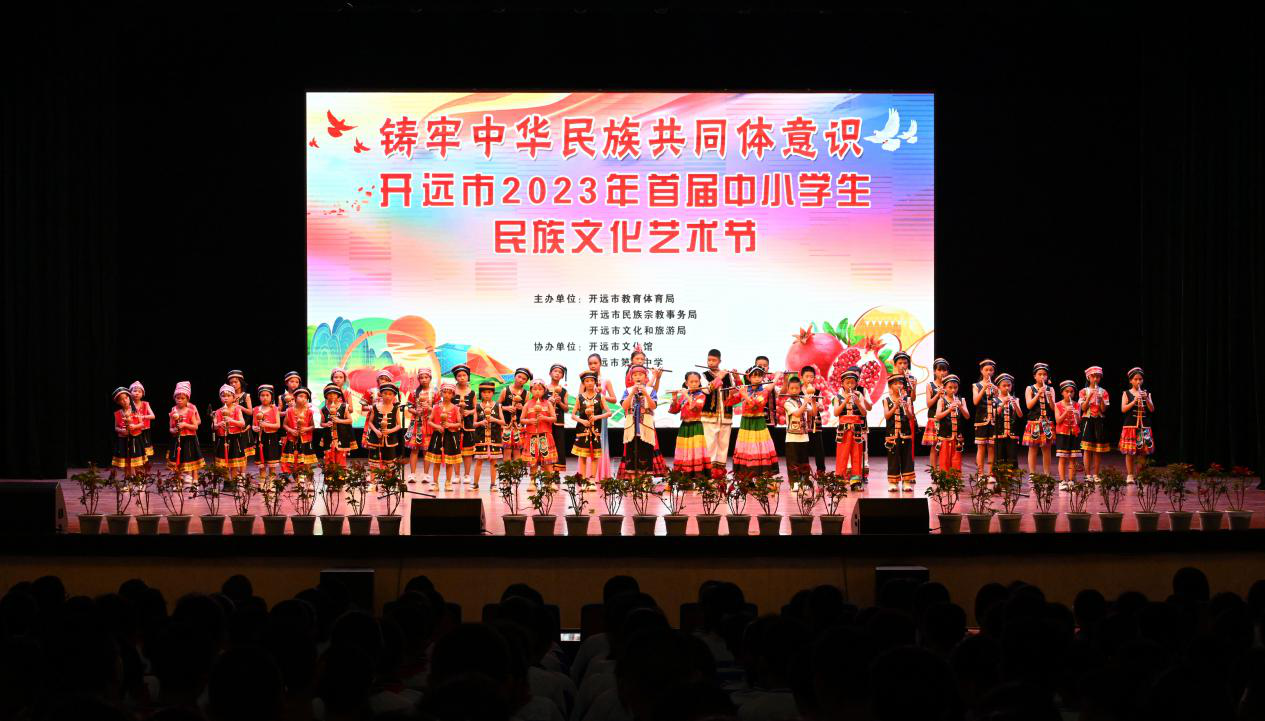 5月30日,由开远市教育体育局、市民宗局、市文旅局等单位联合举办以“铸牢中华民族共同体意识”为主题的首届中小学生民族文化艺术节在开远一中学生会堂拉开了帷幕。