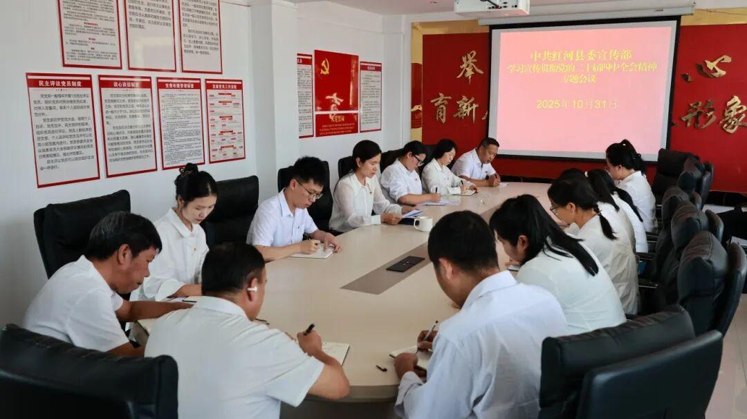 10月31日,红河县委宣传部召开学习宣传贯彻党的二十届四中全会精神专题会议。县委常委、县委宣传部部长曾紫君传达学习《中国共产党第二十届中央委员会第四次全体会议公报》,并安排部署学习宣传贯彻落实工作。会议强调,要迅速掀起学习宣传热潮,强化理论宣传、新闻宣传、社会宣传协同发力,确保全会精神深入人心、落地生根。要深化理论研究阐释,紧扣全会重大部署,立足红河县发展实践,组织力量进行深度解读,广泛凝聚思想共识。要强化意识形态阵地管理,严格落实责任制,牢牢把握正确方向,巩固壮大奋进新时代的主流思想舆论。要着力提升文化软实力,以全会精神全面指引文化事业和文化产业发展,用心用情讲好红河故事,为县域高质量发展提供坚强思想保证和强大精神力量。
