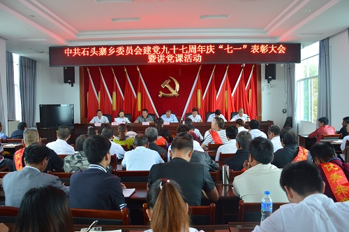 6月27日,石头寨乡召开建党97周年庆“七一”表彰大会暨讲党课活动,以特有的形式喜迎党的97华诞,乡机关全体党员干部,各站所、中小学,卫生院、村党总支书记、主任、监督委员会主任、受表彰的先进代表和新纳的预备党员等70余人参加会议。