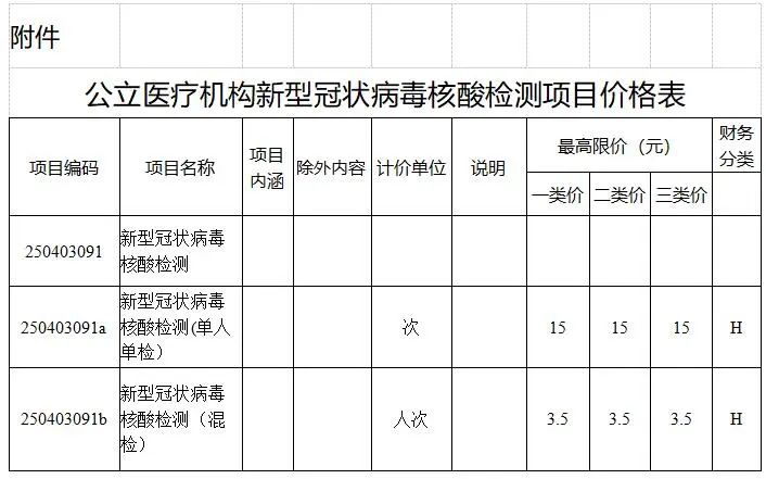 一、调整降低公立医疗机构新冠病毒核酸检测价格。公立医疗机构开展新型冠状病毒核酸检测(单人单检,含检测试剂等耗材)最高限价标准调整为不超过15元/次;开展新型冠状病毒核酸检测(混检,含检测试剂等耗材),不区分混合样本数量,最高限价标准调整为不超过3.5元/人次。