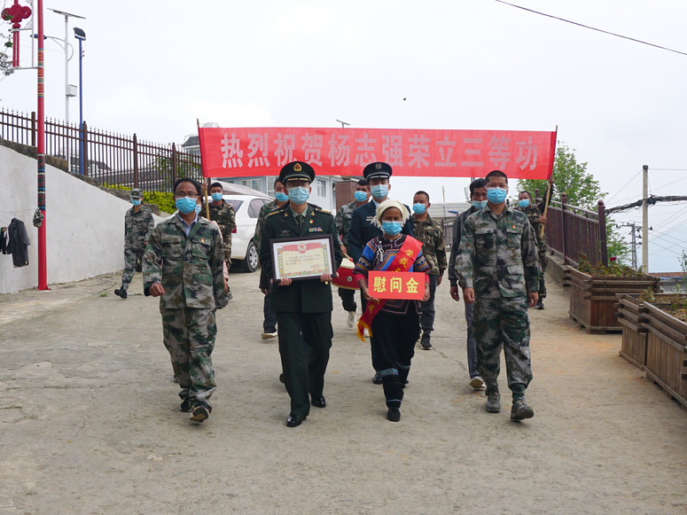 喜报承载着军人的辛勤汗水和无私奉献,也凝聚着军属的大力支持和默默付出。在洛恩乡草果村委会朋洛村和石头寨乡石头寨村,慰问组分别将部队颁发的三等功喜报送到军人李胞民、杨志强家中,为军属戴上光荣绶带,并送上由衷的敬意和祝福。