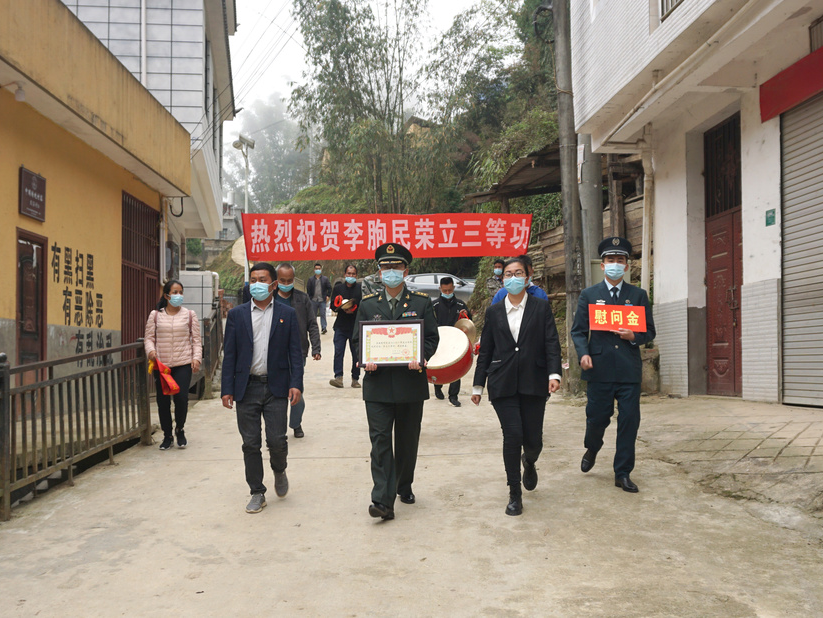 敲锣打鼓送喜报,欢天喜地庆殊荣。3月29日,县委常委、县人武部长沈宗维,红河县退役军人事务局、洛恩乡、石头寨乡主要负责人等组成送喜报慰问组,为军人李胞民、杨志强的家人送去立功喜报。