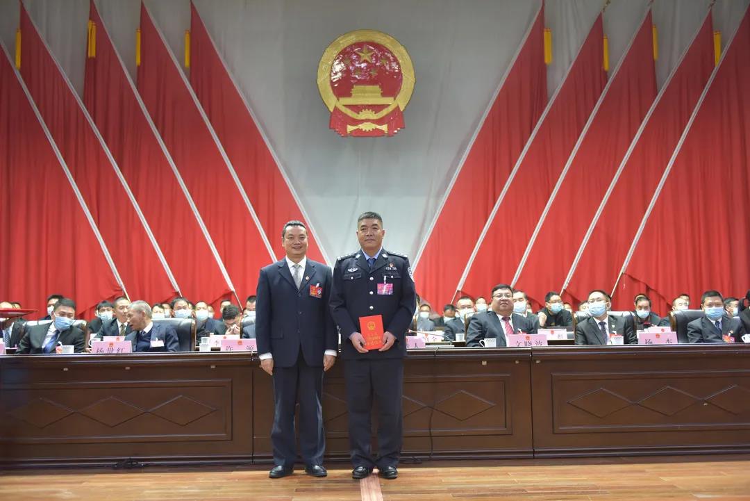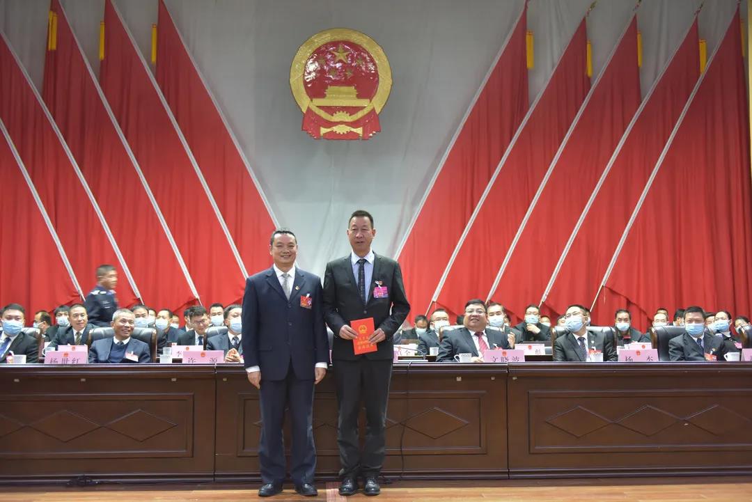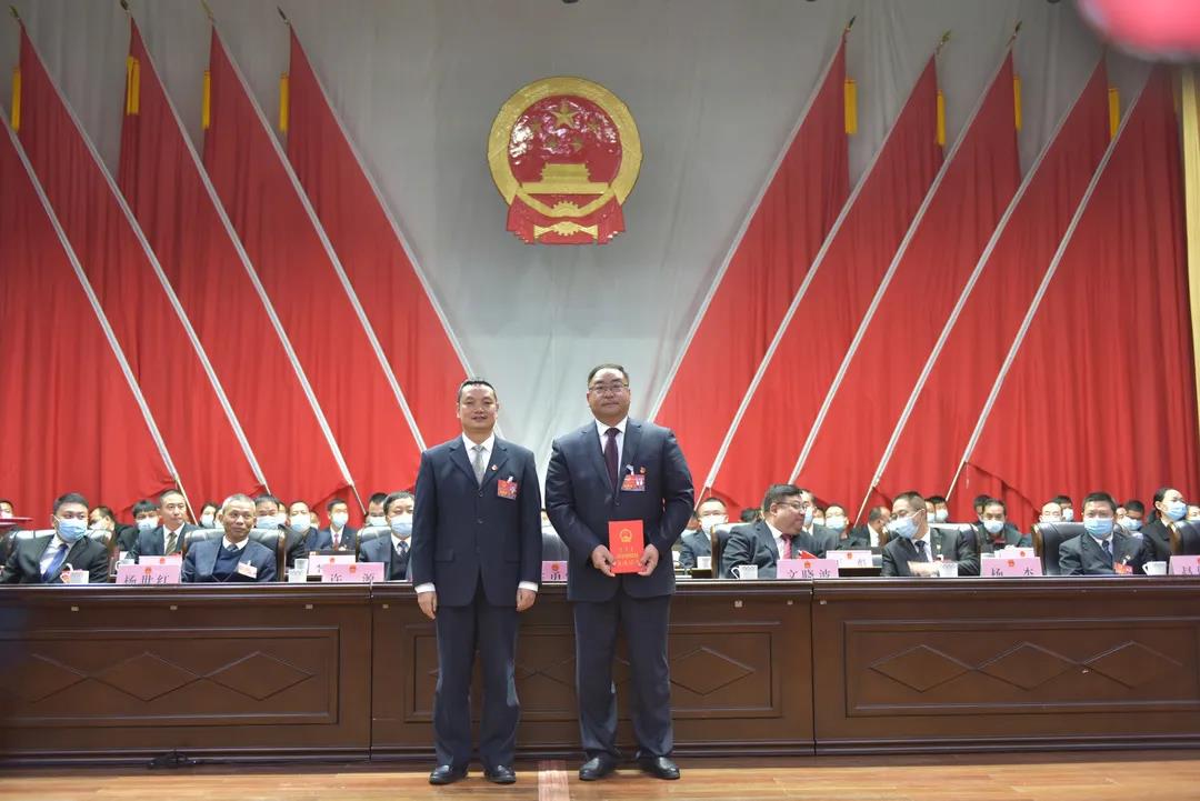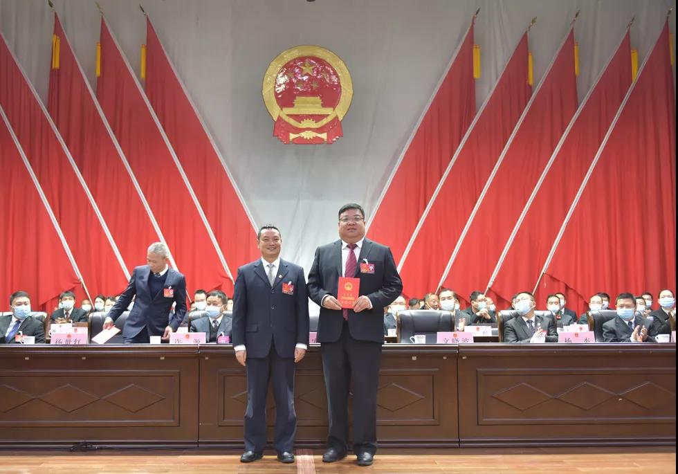 县委书记陈勇宏向新当选的红河县红河县人民法院院长纪文阜颁发证书