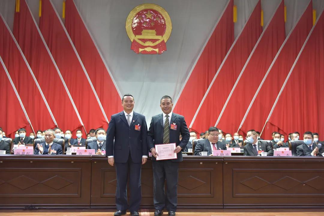 县委书记陈勇宏向新当选的县第十六届人民政府县长文晓波;副县长李树锋、白永成、石家强、张积成、潘崇寺、谭润颁发证书