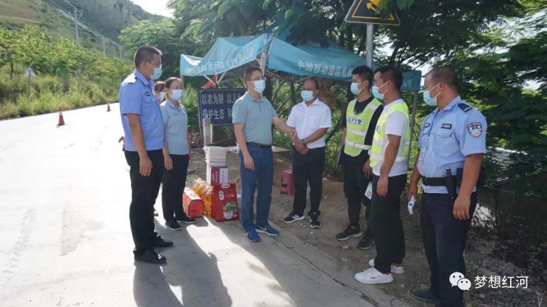 在中秋节来临之际,受县委书记陈勇宏、县长文晓波委托,9月16日,县委副书记杨杰率慰问组到阿扎河乡、大羊街乡、迤萨镇看望慰问疫情防控卡点执勤人员,将党委政府的亲切关怀和温暖送到他们的心坎里,并亲手送上红河县爱心企业捐赠的物资。县政协副主席、工商联主席杨盈盈,县公安局政委张韬,县卫健局相关负责人参加慰问。