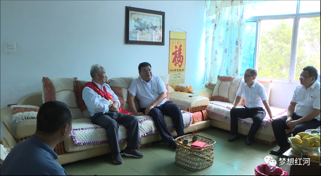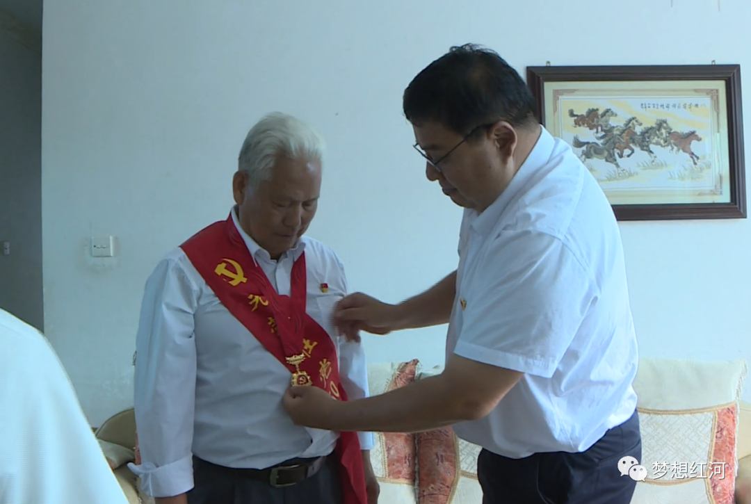 文晓波一行首先来到红河县第二中学,看望慰问了退伍军人、老党员、退休老干部李建龙,与他亲切交谈,关切询问他及其家人身体状况和生活情况,对他为红河县教育事业发展所做的贡献表示感谢,为他送上“光荣在党50年”纪念章,细心帮他佩戴和整理缎带。