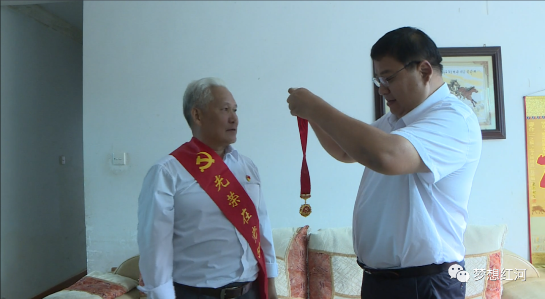 文晓波一行首先来到红河县第二中学,看望慰问了退伍军人、老党员、退休老干部李建龙,与他亲切交谈,关切询问他及其家人身体状况和生活情况,对他为红河县教育事业发展所做的贡献表示感谢,为他送上“光荣在党50年”纪念章,细心帮他佩戴和整理缎带。