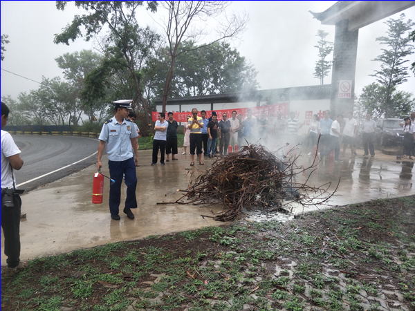 其次由县消防大队工作人员讲解日常防火措施及灭火器的应用,指导参演人员规范化操作灭火器,并现场进行灭火演练。