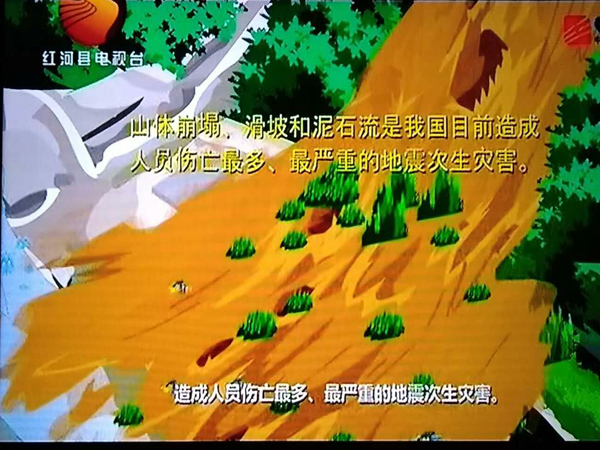二是利用县电视台播放防震减灾宣传片。宣传周期间,每天在《红河县电视台》滚动播放《防震减灾宣传片》6次,连续播放5天30场次。