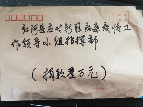 2月9日上午10时左右,一位年近70岁,戴着眼镜,面目和善的老年人来到红河县委县政府应对新型冠状病毒感染的肺炎工作领导小组指挥部办公室,表示要通过指挥部办公室捐赠1万元支持新型冠状病毒感染的肺炎疫情防控工作,捐款将全部用于购买抗击疫情所需的物资。当指挥部办公室的工作人员询问老人姓名时,老人连连摆手,并表示不要写自己的名字。