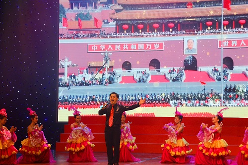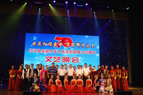 9月29日晚,红河县“欢庆和谐盛世 展望辉煌未来”庆祝中华人民共和国成立70周年文艺晚会在红河县人民会堂隆重举行。晚会共由《共和国的成长之路》、《民族繁荣复兴路》和《共圆中国梦》三个篇章组成,气氛热烈,精彩纷呈,给观众献上了一道华丽的视听盛宴。