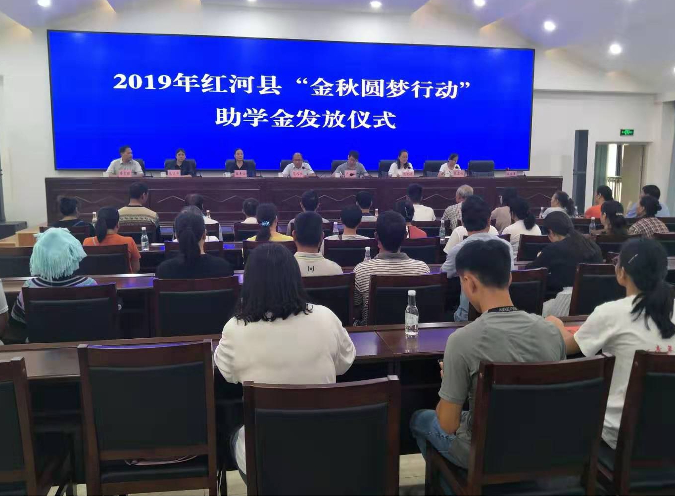 9月3日,红河县2019年“金秋圆梦行动”助学金发放仪式在莲花游客服务中心三楼会议室隆重举行,仪式由县团委书记蒋秀娟主持。县人大常委会副主任、总工会主席简伟荣、副县长卢亚,县妇联主席陈卫华,县红十字会专职副会长张黎梅、县教体局工会主席林育旺、部分受助学生及家长代表参加活动。