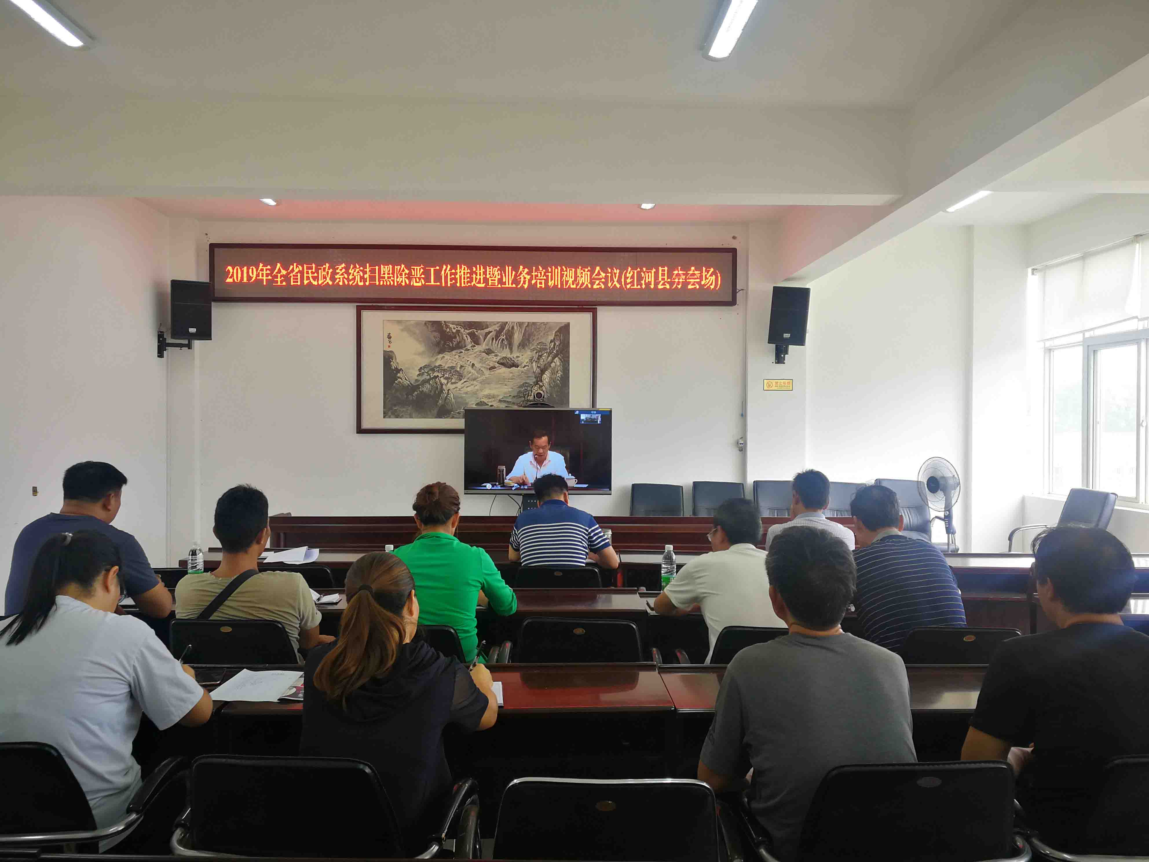 6月14日上午9时,红河县民政局组织参加2019年全省民政系统扫黑除恶工作推进暨业务培训视频会,县民政局主要领导、分管领导、基层政权股和扫黑除恶领导小组全体成员共14人参会。