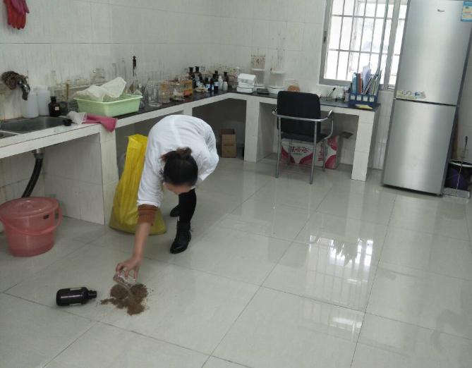 模拟演练化验员不慎将硫酸瓶打翻,导致浓硫酸洒到地面,根据突发环境事件应急预案中的要求,化验员及时将砂子倾倒在泄漏的硫酸上,对硫酸进行吸收分解。同时及时通知应急演练小组组长到场现场查看情况,进行善后处理。