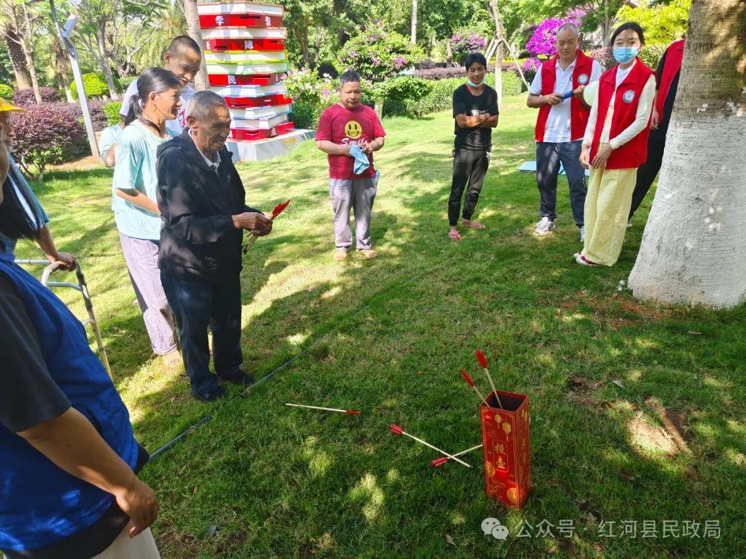 活动现场,一系列趣味横生的小游戏如璀璨的烟火般闪耀登场,瞬间点燃了现场的欢乐氛围。蒙眼击鼓环节,老人们戴上眼罩,手持鼓槌,宛如勇敢无畏的探险家,在工作人员温柔而耐心的引导下,小心翼翼地摸索前行,努力寻找前方的鼓。他们专注的神情、略带蹒跚却又坚定的步伐,引得周围人阵阵欢笑。每一次鼓槌与鼓面的激情碰撞,都伴随着热烈的掌声和欢呼声,那声音仿佛是春天里最动听的旋律,老人们也在游戏中找回了童年的纯真与快乐,仿佛时间在这一刻倒流,他们又回到了那个无忧无虑的年代。投壶游戏则充满了古典的雅韵,仿佛将老人们带回到了古代文人雅士的聚会现场。老人们手持箭矢,全神贯注地投向壶中,眼神中透露出专注与执着。有的老人一投即中,引得众人纷纷赞叹,脸上洋溢着自豪的笑容,那笑容如同春日里绽放的花朵,灿烂而迷人;有的老人虽未投中,但也不气馁,继续尝试,享受着游戏带来的乐趣,在每一次的投掷中,都感受着传统文化的魅力。滚球游戏同样精彩纷呈,老人们用力滚动着球,看着球在轨道上前行,眼神中充满了期待。每当球顺利到达终点,他们都会兴奋地欢呼起来,那爽朗的笑声在公园中回荡,仿佛是春天里最美的音符,奏响了一曲欢乐的乐章。