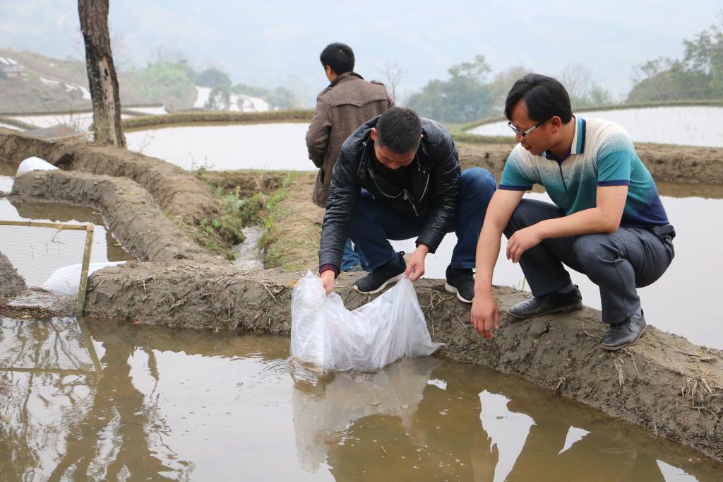 1月25日,在县委、县扶贫办、县农科局等单位的帮助和指导下,一条条生机勃勃的泥鳅种苗被放养到甲寅镇普施梯田片区。