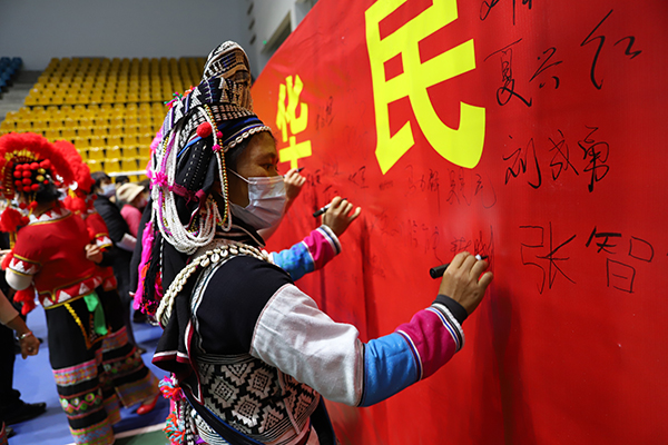 宋文辉向屏边县民族团结进步千人志愿服务队授队旗。该服务队将每月制定1个服务主题,进村入寨为各族群众开展劳动技能、产业发展、人居环境提升等志愿服务活动,争当各族群众的知心人、贴心人、暖心人,携手共建美好家园。仪式上,县民族学会代表宣读了《屏边县铸牢中华民族共同体意识公约》,各界代表共同签订了《屏边县铸牢中华民族共同体意识公约》。《公约》的签字幕宽1.7米(代表屏边县的17个民族),长19.63米(代表屏边县成立的时间1963年),红色背景下镶嵌着《屏边县铸牢中华民族共同体意识公约》内容,象征着屏边县17个民族像石榴籽一样紧紧抱在一起,坚决拥护中国共产党的领导,凝聚民族力量,为实现中华民族伟大复兴贡献屏边智慧和力量。