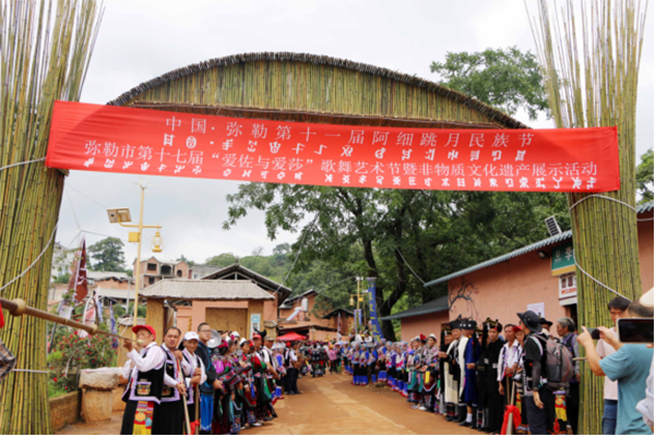 在“彝族火把节”前夕,中国·弥勒第十一届阿细跳月民族节五山分会场——第十七届“爱佐与爱莎”歌舞艺术节暨非物质文化遗产展示活动在五山乡舍姑村委会舍姑小组举行,弥勒市以此活动为契机,充分展现民族文化风采,促进各民族交往交流交融。