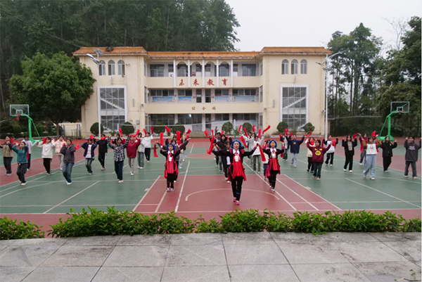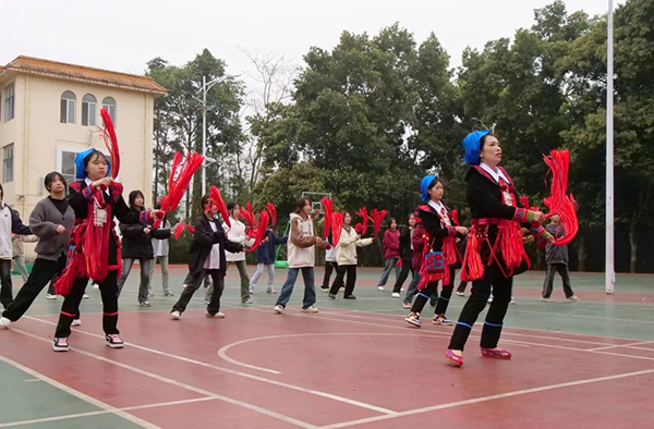 在河口县第三中学,非遗传承人邓国群正带领学生们练习由瑶族舞蹈《盘王舞》改编的民族舞课间操,大家舞动着手中的彩色飘带,舞步动作忽而左转,忽而右旋,处处彰显着非遗文化的魅力,充满了青春与活力。
