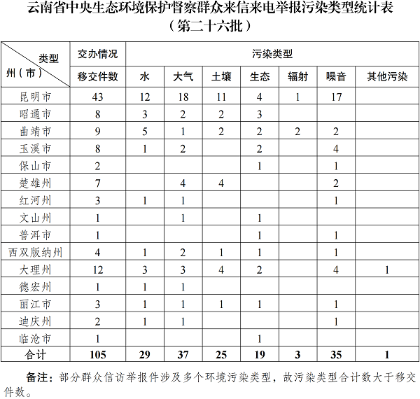 6月4日,中央第七生态环境保护督察组向云南移交第二十六批群众信访举报件105件,其中来电举报52件,来信举报53件。从信访举报件生态环境问题污染类型来看,涉及水29件、大气37件、土壤25件、生态19件、辐射3件、噪音35件、其他污染1件。从区域分布上看,昆明市43件、昭通市8件、曲靖市9件、玉溪市8件、保山市2件、楚雄州7件、红河州3件、文山州1件、普洱市1件、西双版纳州4件、大理州12件、德宏州1件、丽江市3件、迪庆州2件、临沧市1件。截至当日,云南省已累计收到中央第七生态环境保护督察组交办的信访举报件2485件,所有举报件均已及时转交相关州(市)处理。