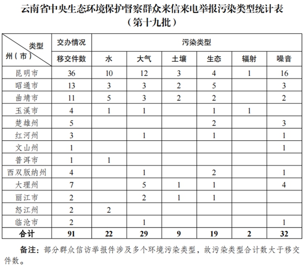 5月28日,中央第七生态环境保护督察组向云南移交第十九批群众信访举报件91件,其中,来电举报64件,来信举报27件。从信访举报件生态环境问题污染类型来看,涉及水22件、大气29件、土壤9件、生态19件、辐射2件、噪音32件。从区域分布上看,昆明市36件、昭通市13件、曲靖市11件、玉溪市4件、楚雄州5件、红河州3件、文山州1件、普洱市1件、西双版纳州4件、大理州7件、丽江市2件、怒江2件、临沧市2件。截至当日,云南省已累计收到中央第七生态环境保护督察组交办的信访举报件1732件,所有举报件均已及时转交相关州(市)处理。