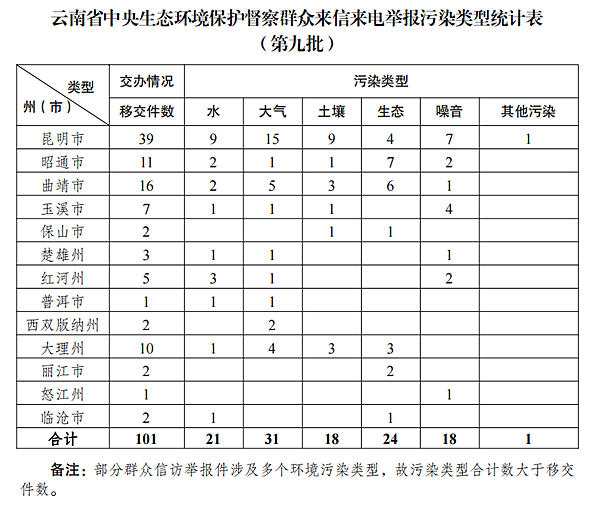 5月18日,中央第七生态环境保护督察组向云南移交第九批群众信访举报件101件,其中,来电举报58件,来信举报43件。从信访举报件生态环境问题污染类型来看,涉及水21件、大气31件、土壤18件、生态24件、噪音18件、其他污染1件。从区域分布上看,昆明市39件、昭通市11件、曲靖市16件、玉溪市7件、保山市2件、楚雄州3件、红河州5件、普洱市1件、西双版纳州2件、大理州10件、丽江市2件、怒江州1件、临沧市2件。截至当日,云南省已累计收到中央第七生态环境保护督察组交办的信访举报件677件,所有举报件均已及时转交相关州(市)处理。