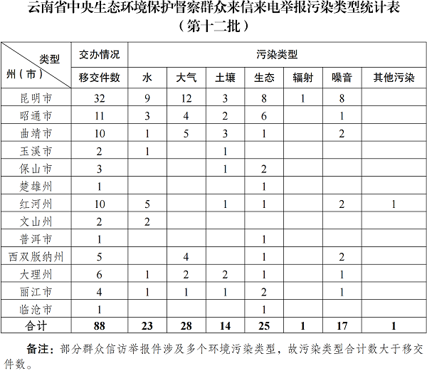 5月21日,中央第七生态环境保护督察组向云南移交第十二批群众信访举报件88件,其中,来电举报54件,来信举报34件。从信访举报件生态环境问题污染类型来看,涉及水23件、大气28件、土壤14件、生态25件、辐射1件、噪音17件、其他污染1件。从区域分布上看,昆明市32件、昭通市11件、曲靖市10件、玉溪市2件、保山市3件、楚雄州1件、红河州10件、文山州2件、普洱市1件、西双版纳州5件、大理州6件、丽江市4件、临沧市1件。截至当日,云南省已累计收到中央第七生态环境保护督察组交办的信访举报件948件,所有举报件均已及时转交相关州(市)处理。